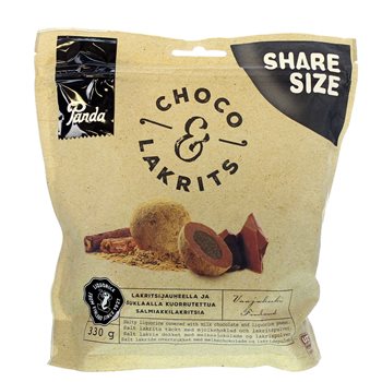 Choco Licorice from the Finnish candy manufacturer Panda are delicious balls consisting of salty licorice covered with milk chocolate and rolled in licorice powder, which gives an exquisite flavor combination of salmiak and sweet. Here in a share-friendly large bag of 330 grams.
