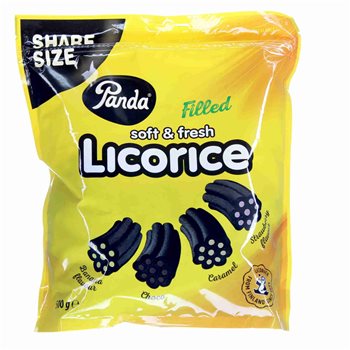 The yellow bag with Panda Licorice Filled is full of licorice with different types of flavor filling. There is licorice with a filling of chocolate, caramel, banana flavor and strawberry flavor. Huge bag with 500 grams.