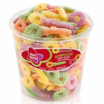 Chicle de vino agrio con sabor a fruta de la banda roja. Los chupetes de Red Band son de colores brillantes, lo que los convierte en un éxito seguro con los más pequeños. Además, los muchos colores también significan que obtienes muchos sabores en el mismo pedazo de dulces. Las tetinas también están confitadas con azúcar, lo que contribuye al buen sabor y compensa la acidez. El cubo con 1200 gramos contiene aproximadamente 100 pezones de vinos.