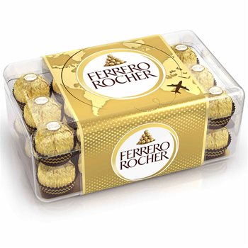Las conocidas bolas de chocolate en el paquete dorado de Ferrero. En esta caja grande, no hay menos de 30 piezas de los deliciosos chocolates Rocher, que consisten en una avellana asada y una crema de chocolate suave, en una bola de gofre crujiente, cubierto de chocolate y pequeños trozos de avellanas asadas, que dan Una experiencia de sabor fantástica.