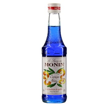 Cu frumoasa sa culoare albastră profundă, siropul albastru Monin Curacao luminează pur și simplu bara. Siropul este obținut din coaja de portocale uscate, ceea ce oferă un gust de portocale ușor amar. Siropul adaugă un cocktailuri exotice la cocktail -uri, pumn de fructe sau băuturi răcoritoare și merge deosebit de bine cu băuturi cu aromă de citrice.